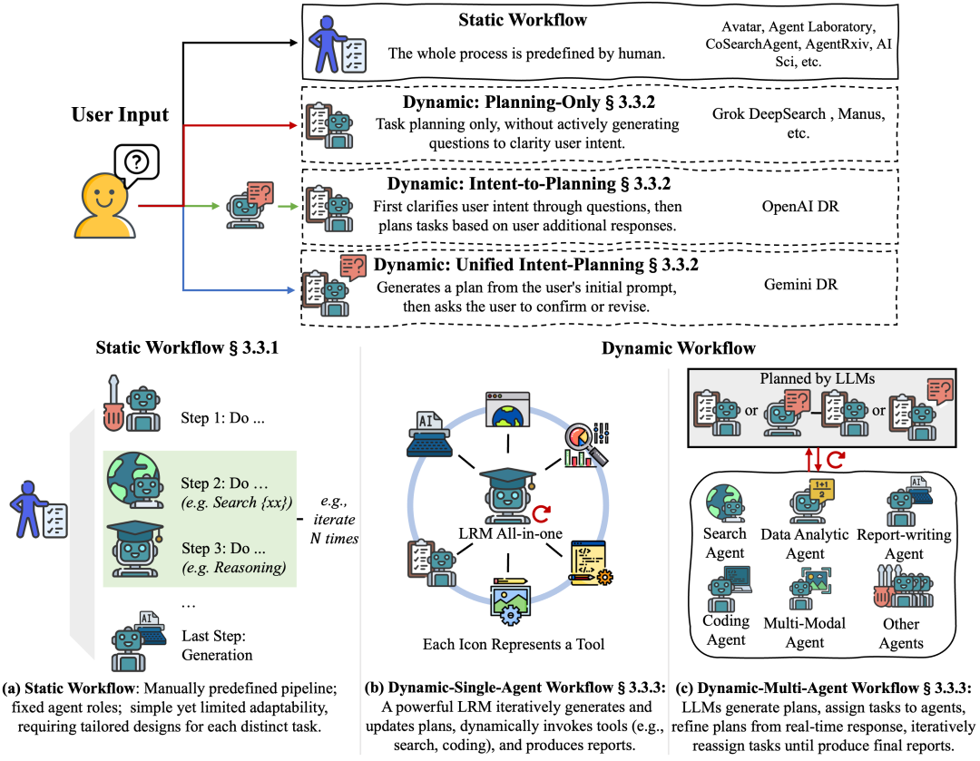 在《DEEP RESEARCH AGENTS: A SYSTEMATIC EXAMINATION AND ROADMAP》这篇论文中,动态工作流模式的 Agent 被进一步分成两种不同的形态:动态单智能体系统 vs 动态多智能体系统。