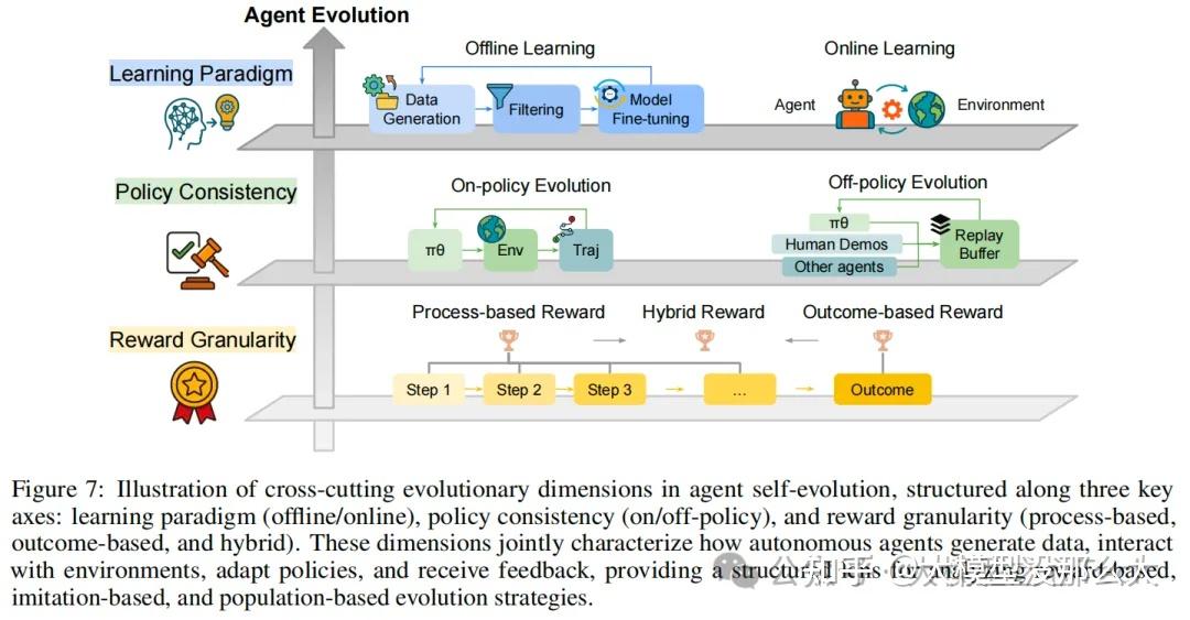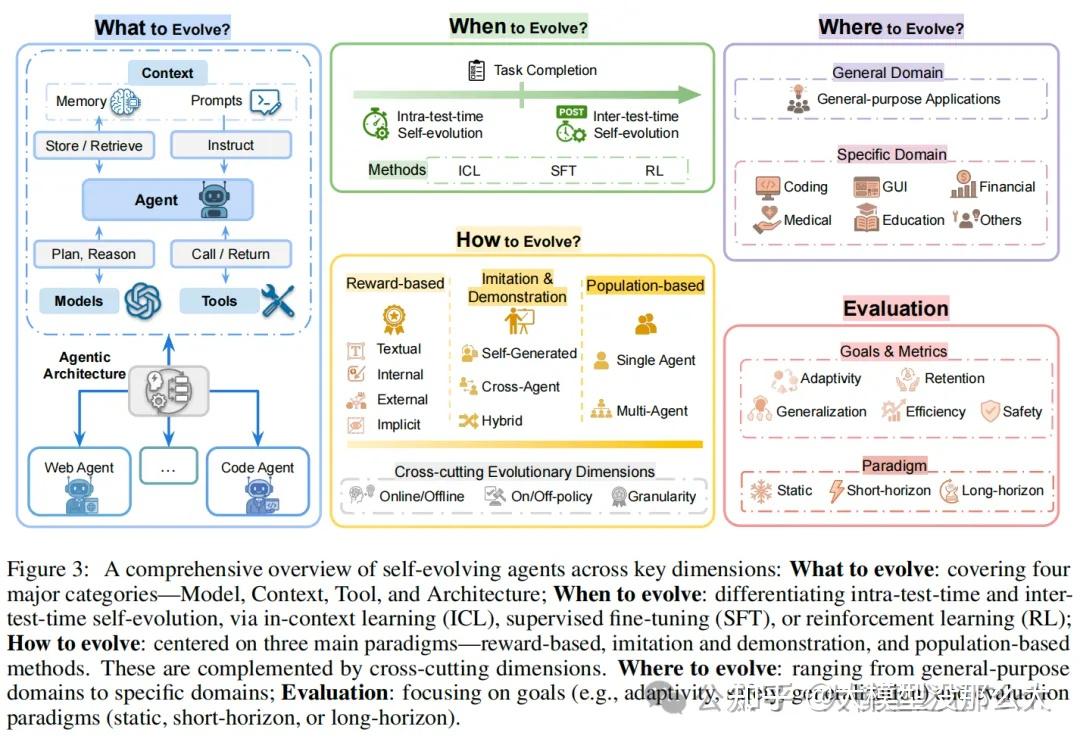 追求自进化是构建先进、自主且日益通用的人工智能的核心。对于大语言模型(LLMs)及其智能体扩展而言,如何持续、自主且高效地进化其能力已成为一个核心挑战。因此,第三个关键方面是如何实现进化。