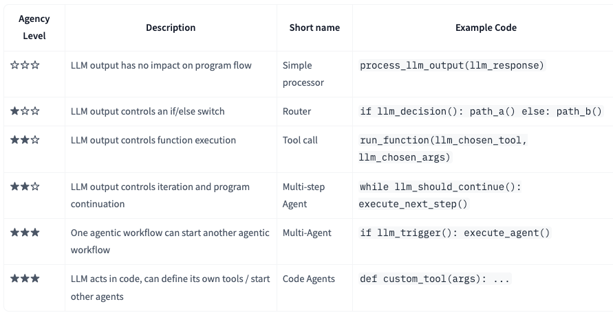 - Hugging Face 定义了 Agent 的六个等级,其中 Code Agent 是其中的最高级别: