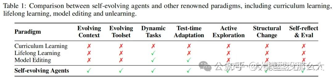 自进化智能体与多个现有的学习范式密切相关,但又有着本质的区别。理解这些关系有助于明确其独特性。