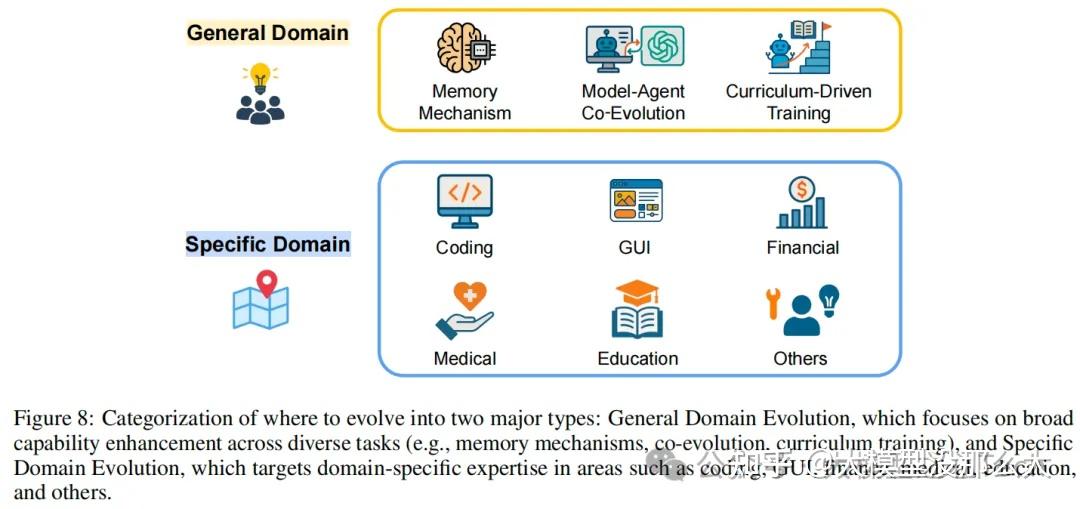 自进化智能体已在众多领域和应用中推动了显著进步。总体而言,这些应用可以系统地分为两大类:(1)通用领域进化(general domain evolution),即智能体系统通过进化以扩展其在各种任务中的能力,这些任务大多处于数字领域;以及(2)专用领域进化(specialized domain evolution),即智能体专门针对特定任务领域进化,以提升其在该领域的专业能力。本质上,通用型智能助手的进化侧重于将学习到的经验迁移到更广泛的任务集上,而专用智能体的进化则侧重于在特定领域内深化其专业知识。