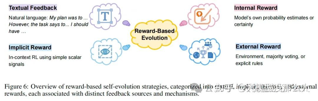 本章旨在系统地梳理和分析主要的自进化方法家族,为理解其原理、机制和相互作用提供一个统一的框架。我们首先从基于奖励的进化开始,该方法的核心在于设计奖励信号——从自然语言反馈和内部置信度指标到外部或隐式信号——以指导迭代的自我改进。接着,我们探讨模仿与示范学习,即智能体通过学习高质量的范例(无论是自我生成的,还是由其他智能体或外部来源提供的)来提升自身能力。当示范丰富或能够自主合成时,这一范式尤其强大,并已在推理和多模态领域推动了显著进展。最后,我们介绍基于群体和进化的方法,这些方法借鉴了生物进化和集体智能的灵感。这些方法维护着智能体变体或协作智能体的群体,利用选择、变异、交叉和竞争等机制并行探索解空间,促进多样性,并催生出新颖的策略或架构创新。