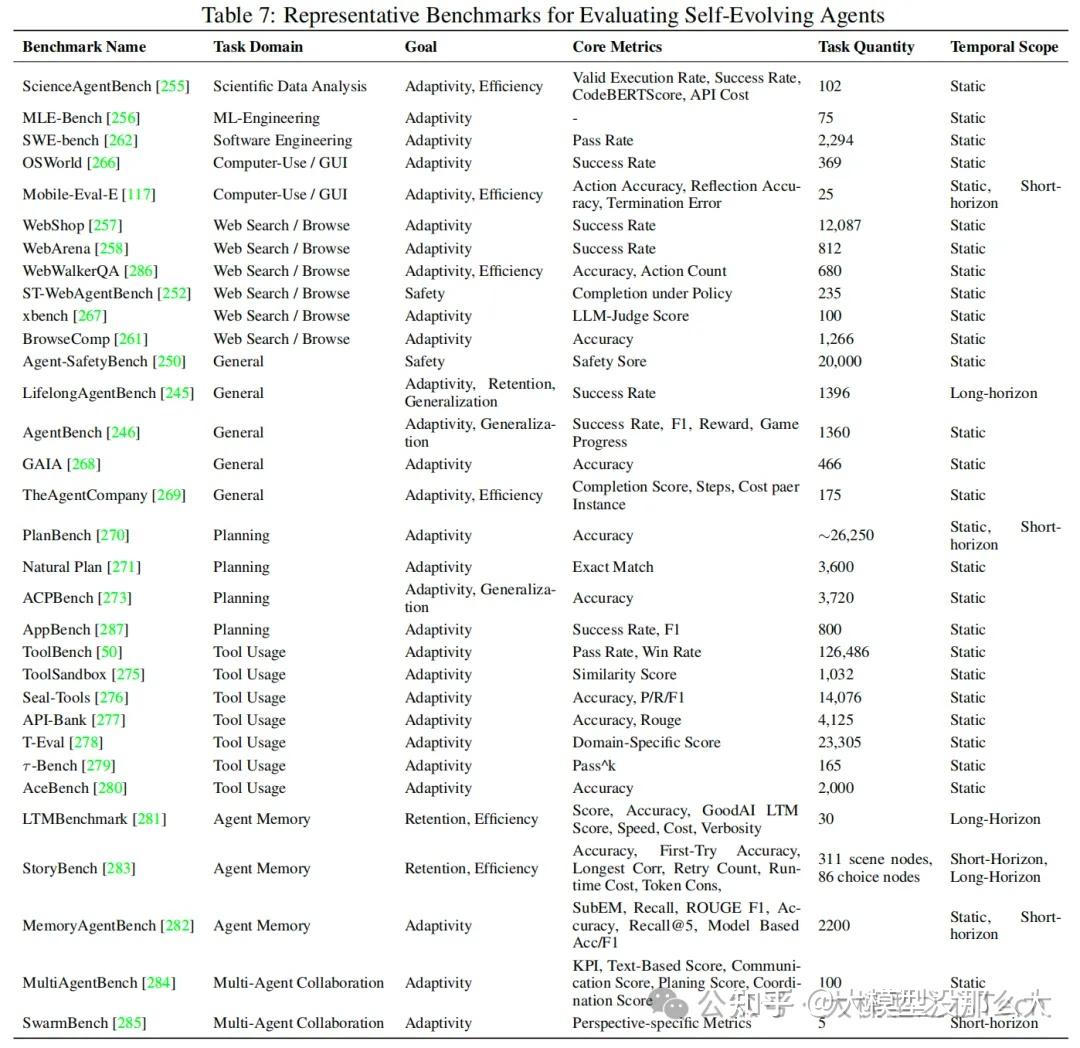 - 进一步研究了专为自进化智能体定制的评估基准或环境,突出了与适应性、鲁棒性和现实世界复杂性相关的新兴指标和挑战。