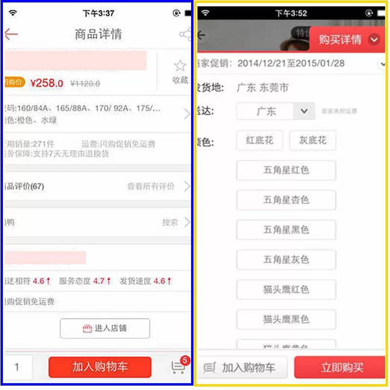 2.从产品角度来说,立即购买适用于一些一次性购买的产品,比如机票、旅游产品、电影票、保险。这类产品一个用户不太可能同时购买多份,所以立即购买可以让用户下决定购买后快速完成购买流程。所以像团购类型的APP就只有“立即购买”按钮。这里多说一句,为什么导购类型的APP也是只有“立即购买”按钮呢?那是因为导购APP只能提**品页面的展示,真正的购买是要跳转到第三方的H5页面的,而第三方是有可能很多家的。这也就决定了目前技术还没办法实现在导购APP中添加进购物车,然后按商品再一个一个的跳转去第三方H5页面完成购买。