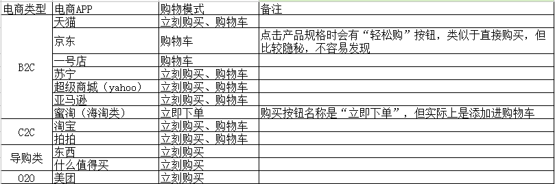 在调研的这12个电商APP(其中B2C的7个,涵盖了自营类、招商类、海淘类、国外电商;C2C的2个;导购类的2个,O2O的1个)中,同时具备立刻购买和购物车的占50%(B2CAPP中同时具备的占57%,C2CAPP中同时具备的占100%);只有购物车功能的占25%(B2C应用占43%);只有立即购买的占25%,都在导购类和O2O类的APP中。