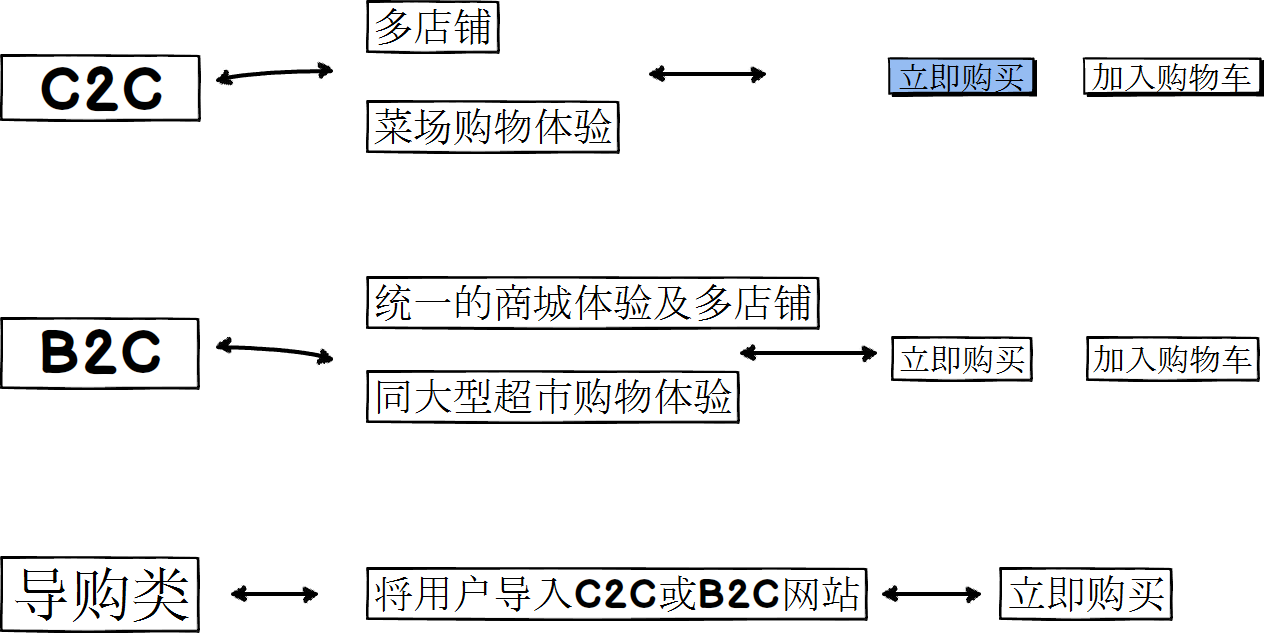 目前的电商网站主要分为C2C、B2C、导购类、O2。C2C的模式很像菜场,就是一个大菜场里,各个摊位租给菜贩,每个菜贩之间都是独立的,独立的资金核算、独立的送货服务。B2C可以理解为超市,像沃尔玛建立了一套自己的库存、物流、收银、服务的体系,由沃尔玛独立采购产品,然后进行销售,这样给用户的服务都是统一的,当然现在的超市也会开放柜台给厂家,只要交租金就给你货架进行销售,超市只负责帮你收银,其余的要厂家自己搞定,所以现在的B2C是传统B2C加上C2C的混合模式。