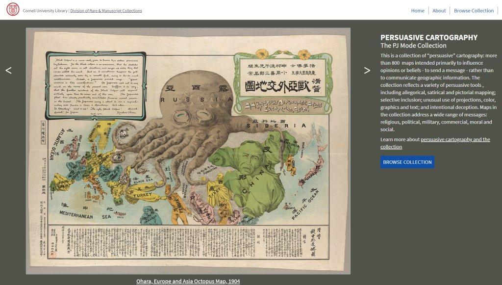 收藏800多幅古旧地图,和中国相关的有二十多幅。这个网站和前面几个相比,有非常大的特色,就是它提供了一个Persuasive Maps: PJ Mode Collection的集合,提供了大量反映政治、军事、经济、文化、社会相关的地图作品。