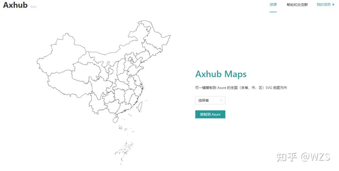 在该网站可以下载中国及各省市的空白地图,通过点击地图或者在左侧栏中选择所需地区的地图,点击复制到Axure按钮,然后在Axure中进行尺寸等设定,通过粘贴或者转换SVG格式导出即可使用;
