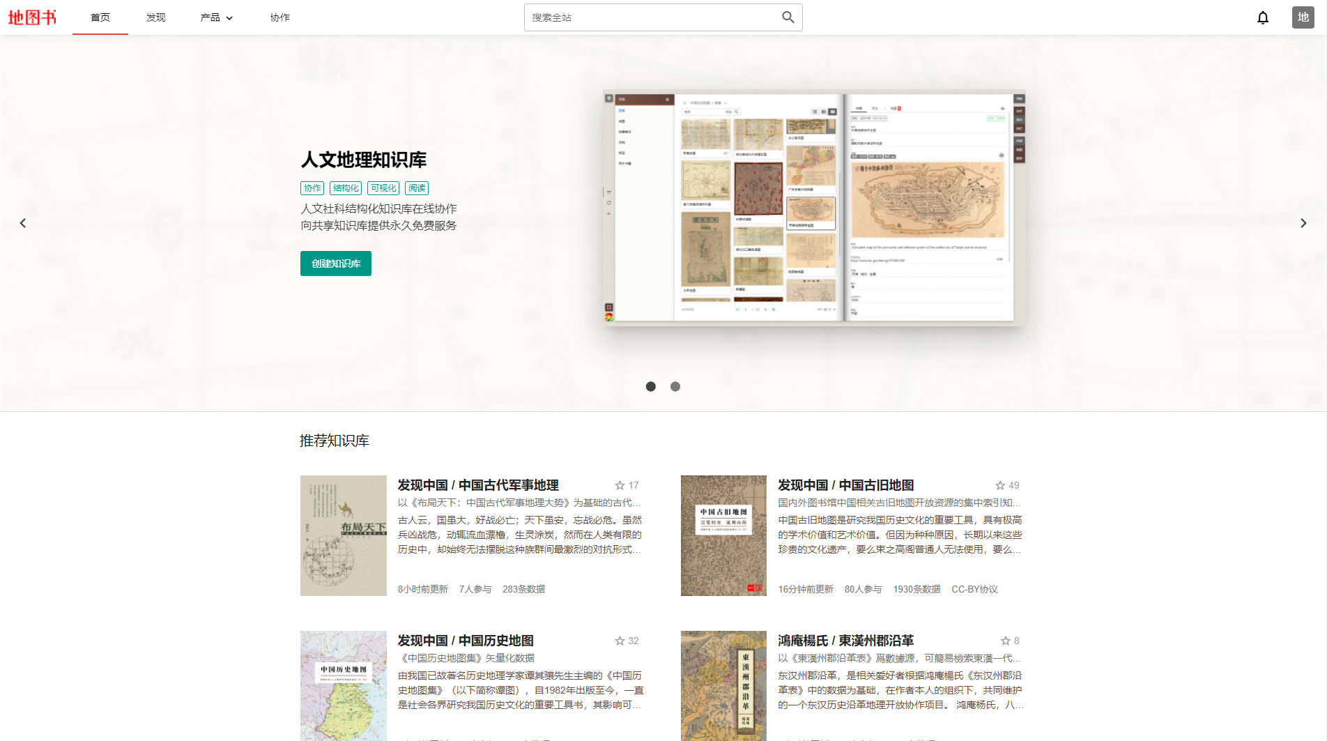 地图书是一个人文地理知识库在线协作可视化平台,目前已经上线了中国古旧地图,中国历史地图,中国古代军事地理等多个知识库。