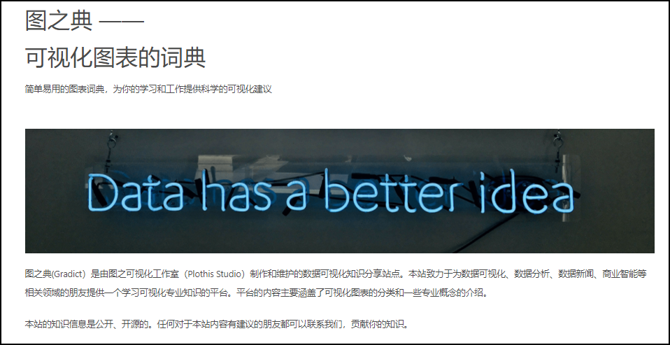 它既是一个内容全面的数据可视化知识共享网站,也是一个可以帮助你学习可视化专业知识的实用网站。