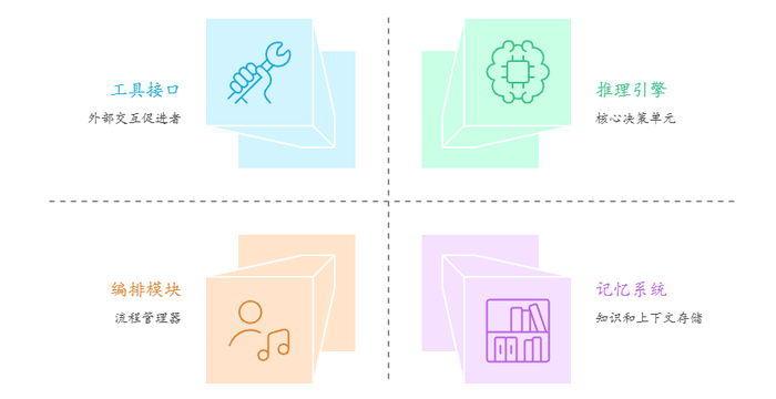 推理引擎作为Agent的"大脑",基于大语言模型实现意图理解、计划制定和任务执行。记忆系统则分为短期记忆(维护会话上下文)和长期记忆(存储用户偏好和历史交互),赋予Agent学习和成长的能力。编排模块负责协调其他组件,管理整体执行流程,而工具接口则是Agent与外部世界交互的"手脚"。
