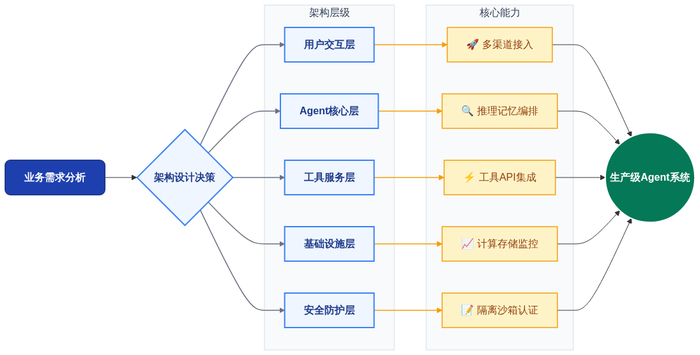 架构设计需要在功能完整性和系统复杂度之间找到平衡。一个典型的AI Agent架构包括以下几个层次: