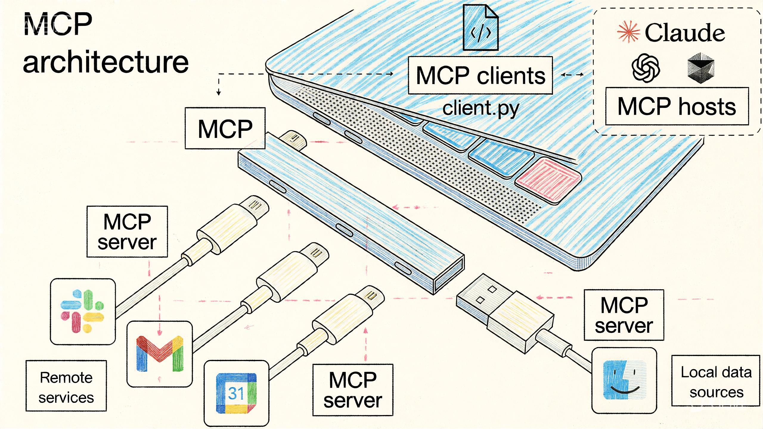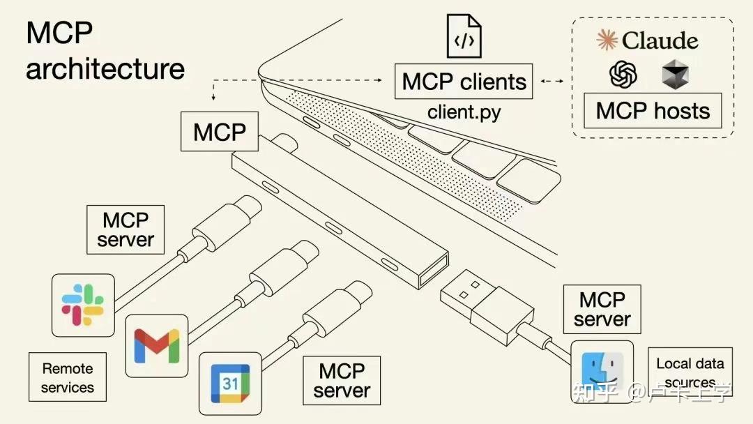 你可以把它理解为 AI 世界的“USB 接口”—— 就像 USB 让手机、电脑、显示器、充电器之间实现即插即用一样,MCP 让任意 AI 应用(比如 Claude、ChatGPT、本地 LLM)都能无缝连接任意符合 MCP 规范的工具服务。