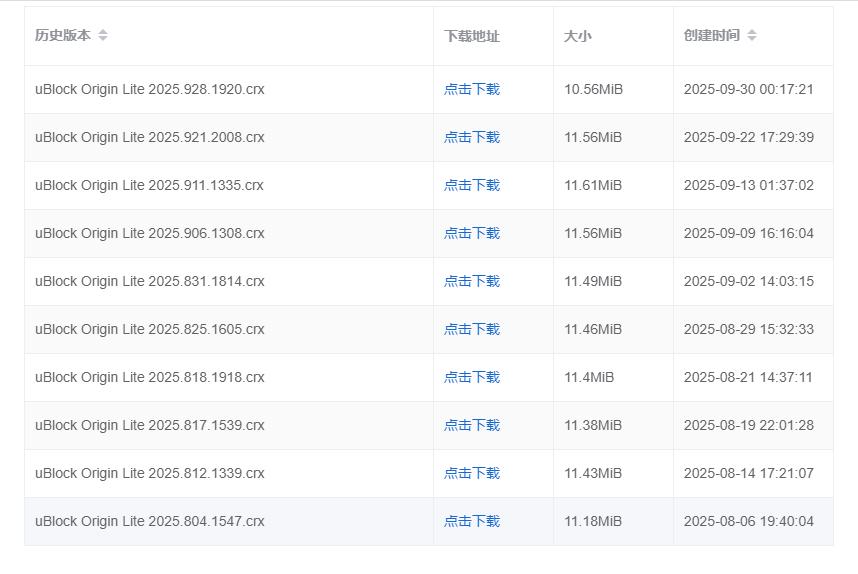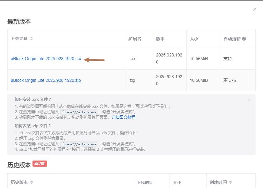 - 如果是因为浏览器内核版本过低导致无法成功安装的,可以下拉到历史版本界面,下载旧日期浏览器插件扩展。