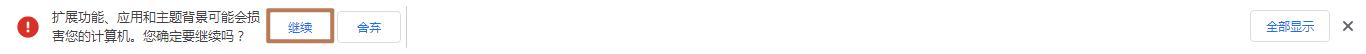 - 浏览器底部会弹出「扩展功能、应用和主题背景可能会损害你的计算机。你确定要继续吗?」提示,点击继续按钮。