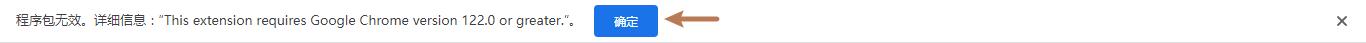 - 如果安装过程中弹出「程序包无效。详细信息: “This extension requires Google Chrome version 122.0 or greater.”。」信息,说明是浏览器内核版本过低,而浏览器插件扩展要求至少内核在122.0以上才能安装。