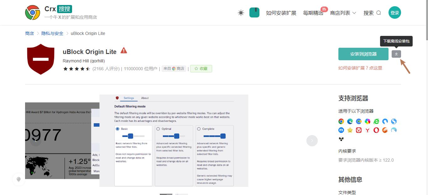 - 打开某个浏览器扩展页面,点击右侧的「下载离线安装包」按钮。