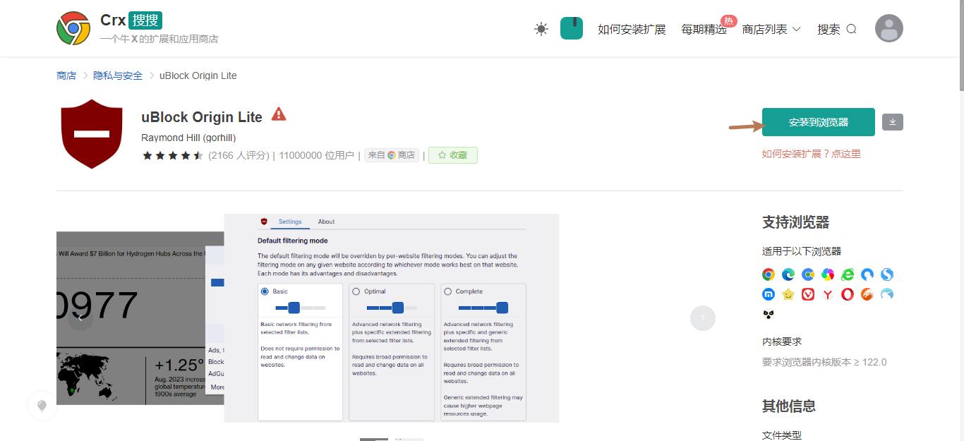 - 打开某个浏览器扩展页面,点击右侧的「安装到浏览器」按钮。
