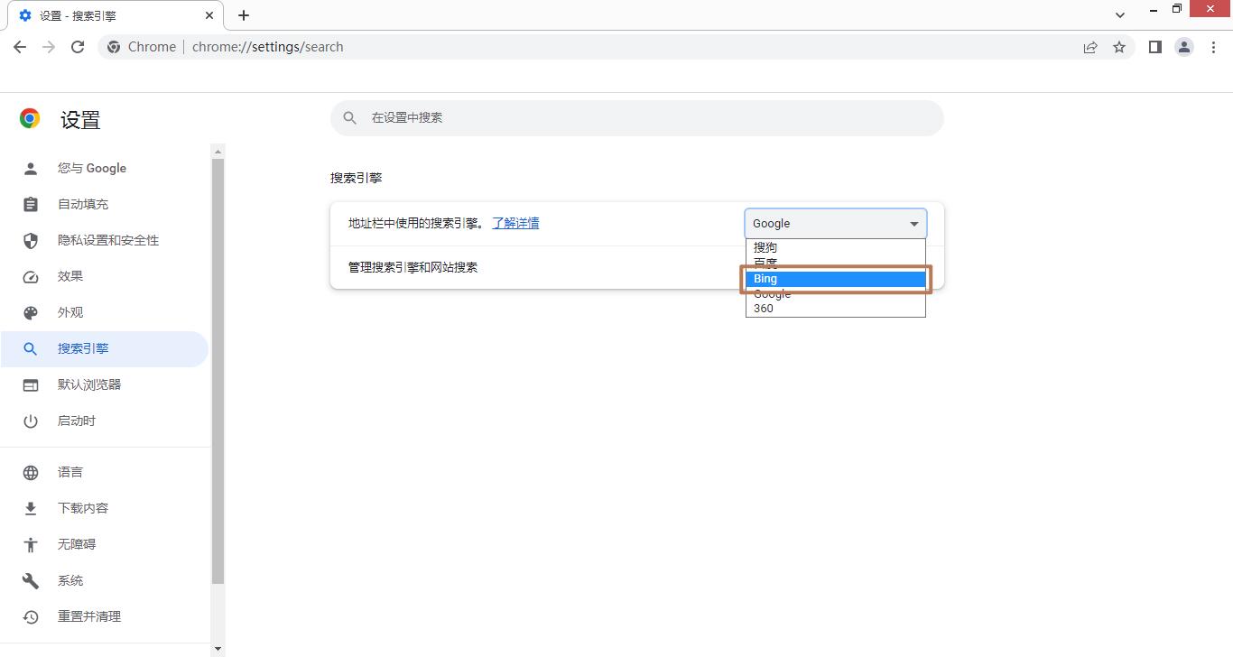 - 切换到「搜索引擎」选项卡,点击「地址栏中使用的搜索引擎」复选框,选择列表中的 bing 搜索引擎。