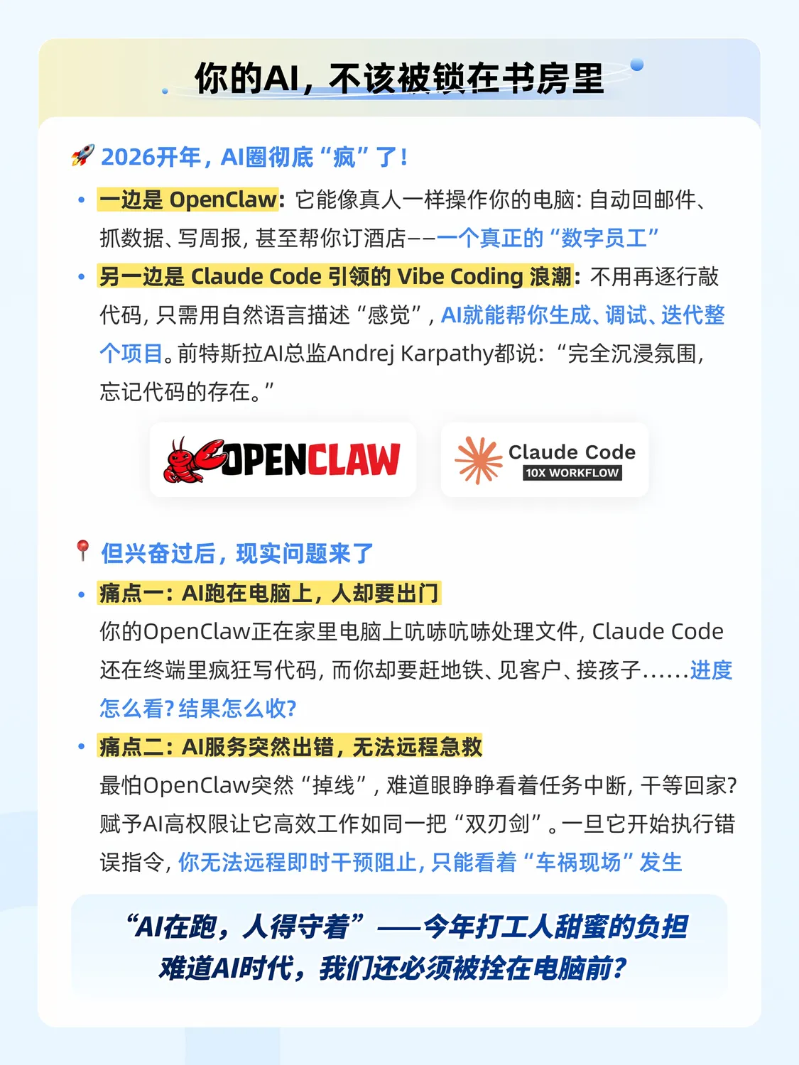你的 OpenClaw 正在家里电脑上勤勤恳恳地处理文件,Claude Code 还在终端里疯狂写代码,而你却要赶地铁、见客户、接孩子……进度怎么查看?结果怎么接收?