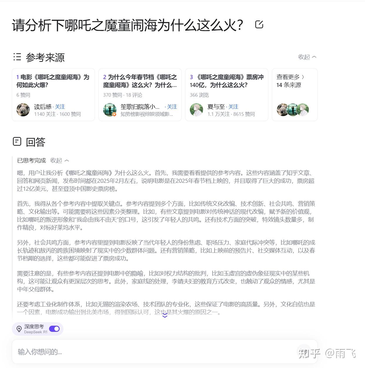 我们以最近热门的电影哪吒为例,来体验下知乎直答的效果。