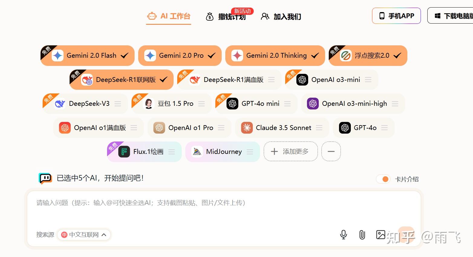 支持一次请求多个AI模型,同样有联网功能,文件上传功能。由于接入 DeepSeek 以及联网功能比较早,获得了不少流量,属于比较火爆的网站。