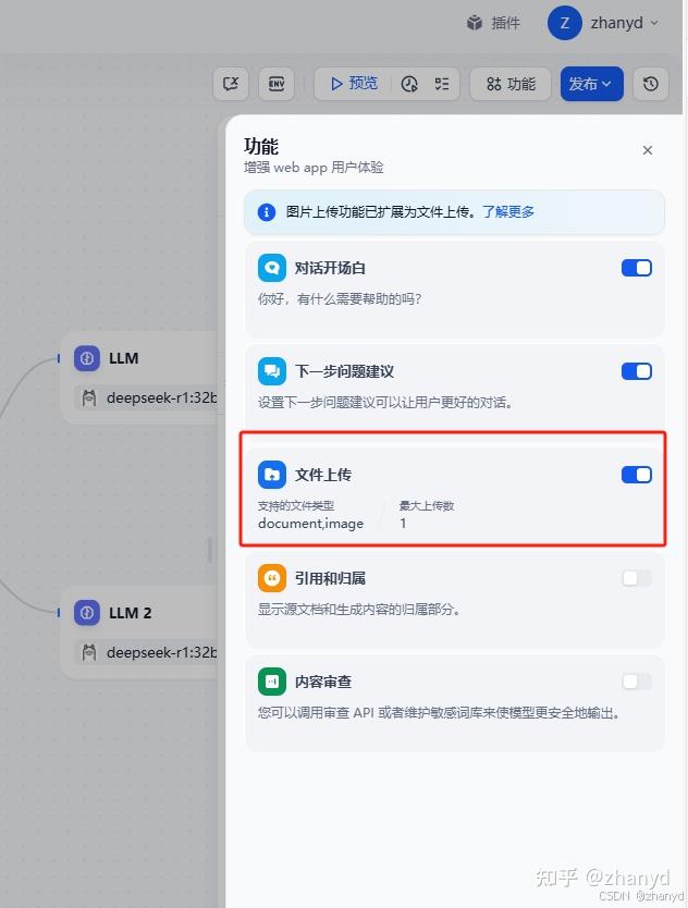如果要在聊天窗口增加文件上传功能,需要用到Chatflow或者工作流,我下面以Chatflow为例,配置一个带文件上传功能的聊天窗口,我用的Dify版本是1.1.3。
