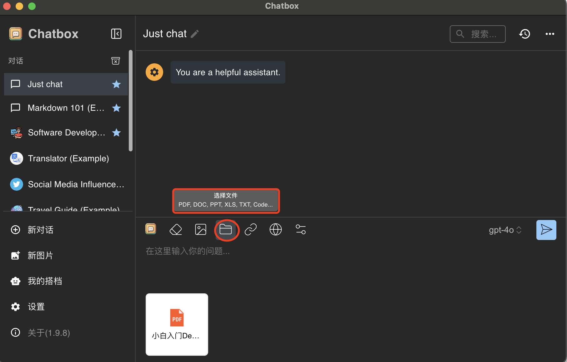 点左下角的「文件夹」图标,可以看到支持多种格式的文件上传,点开后,选择要上传的文件即可