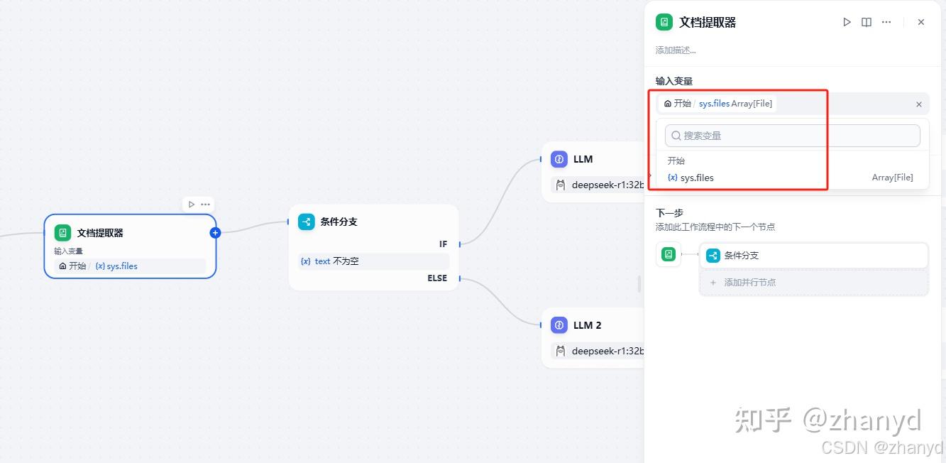 由于本地部署的DeepSeek不能直接解析文件,还需要添加一个文档提取器,把文件中的内容提取出来。