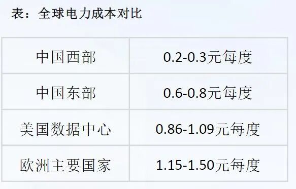 从全球电力成本对比来看,中国西部电价仅0.2–0.3元/度,具有显著优势;中国东部为0.6–0.8元/度;美国数据中心电价在0.86–1.09元/度区间;而欧洲主要国家则高达1.15–1.50元/度。