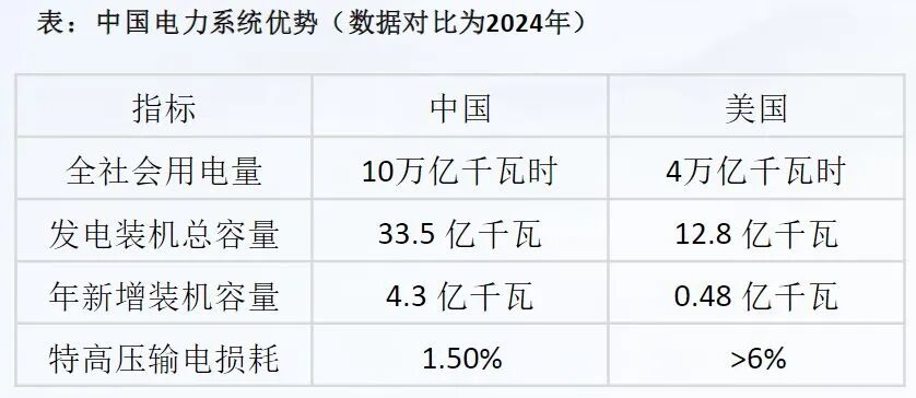 进一步从电力系统能力看,中国在2024年的全社会用电量达10万亿千瓦时,发电装机总容量33.5亿千瓦,年新增装机4.3亿千瓦,特高压输电损耗仅1.5%,多项指标显著领先。这为中国在算力基础设施建设与成本控制方面提供了系统性优势。反观全球,随着AI算力需求爆发,能源结构转型过程中的供给紧张、地域性能源价格高企,正不断推高算力的真实成本,形成“算力通胀”的压力。