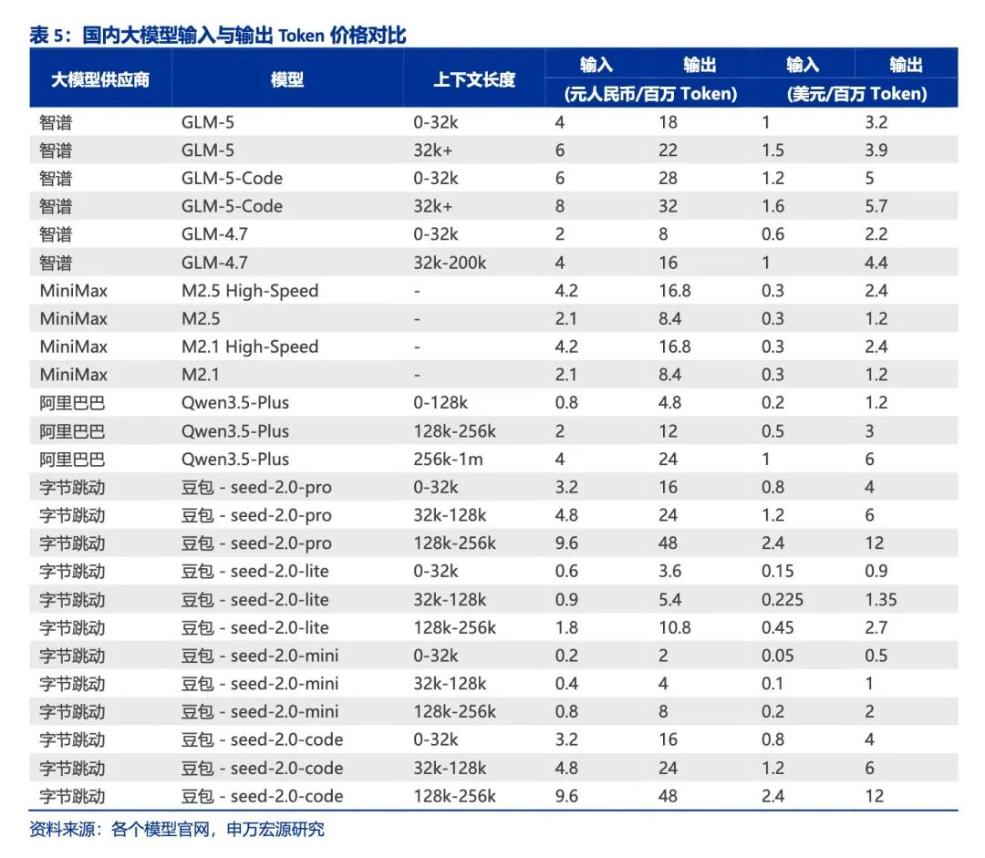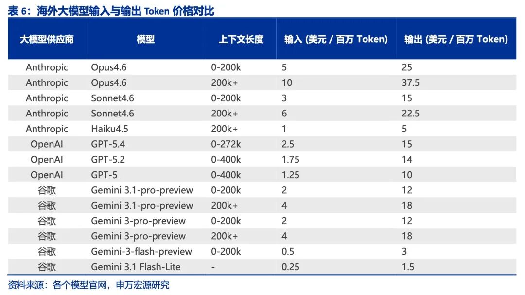 目前,海外大模型的Token价格普遍处于高位。以Anthropic的Opus 4.6模型为例,其输入价格在5–10美元/百万Token,输出价格则高达25–37.5美元/百万Token。OpenAI的GPT-5系列相对具有竞争力,输入价格在1.25–2.5美元/百万Token,输出价格在10–15美元/百万Token。谷歌的Gemini系列中,Gemini 3.1 Flash-Lite定价最低,输入仅为0.25美元/百万Token,输出为1.5美元/百万Token,展现出在轻量化场景下的成本优势。整体来看,海外头部模型的输出Token价格通常是输入的3–8倍,体现了生成过程对算力的更高消耗。