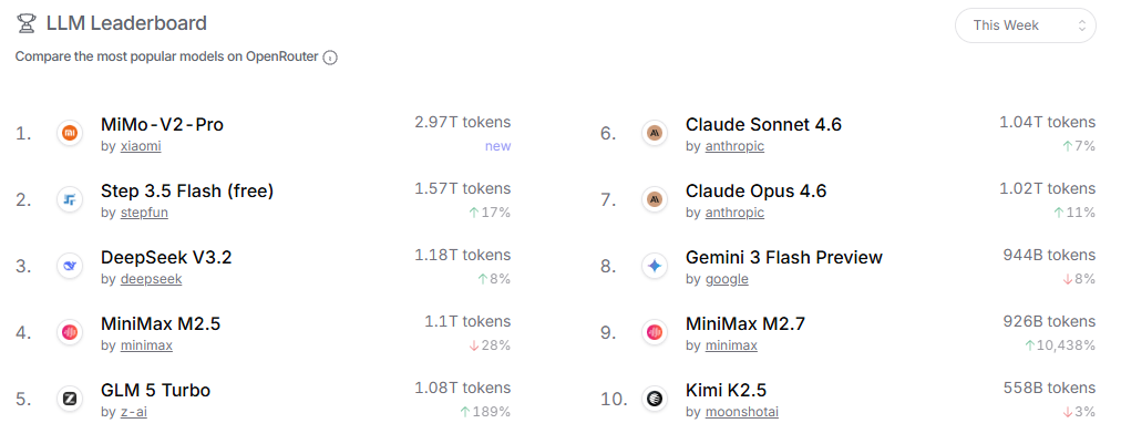 其中,MiMo-V2-Pro、Step 3.5 Flash、MiniMax M2.7、DeepSeek V3.2等国产模型持续贡献着可观的token调用量。Claude、Gemini、GLM等知名系列同样表现活跃。