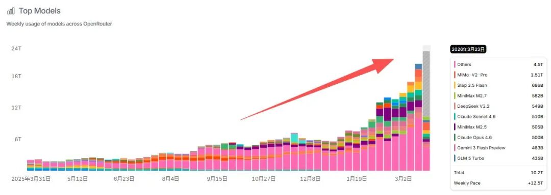 这是OpenRouter平台发布的模型使用量最新趋势图,自2025年3月以来,模型周使用总量从10.2T一路飙升至2026年3月的24T以上,周增速高达+12.5T,呈现出近乎指数级的增长态势。