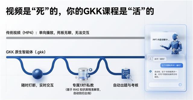 就在这一背景下,一个专为学校、单位、教师设计的 AI智能体——GKK 正在迅速走红,被认为是教育、宣传、服务领域的“组织级小龙虾”。虽然两者都是全自动的 AI 智能体,但 GKK 专注于为单位、老师、博主等提供对外的全自动交互服务。它的核心逻辑是“PPT 即内容,智能体即讲师”,从技术维度看,GKK 并非视频生成工具,其核心突破在于独创并获得专利授权的 .gkk 文件格式。这种格式封装了讲解逻辑、3D 、知识图谱及 AI 智能体的“行为容器”或“运行态内容体”。这意味着内容本身具有了“思考”和“回答”的能力。