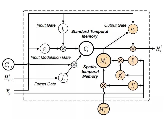 循环单元ConvLSTM的设计目的是通过门控结构适当地保留和忘记过去的信息,然后将其与当前的空间表示形式融合。然而,作者说堆叠的ConvLSTMs并没有为逐步重复的状态转换增加额外的建模功能,因为只是普通的每层之间连接起来,没有增加额外的深度