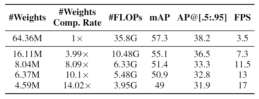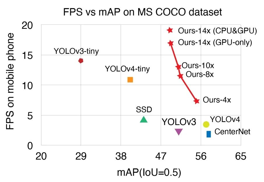 他们的实验结果表明,当使用YOLOv4为基础模型进行优化时,他们的优化框架可以成功将原模型大小压缩小14倍,在未使用GPU-CPU协同计算优化时,将每秒检测帧数(FPS)提升至17,且达到49的准确率(mAP)。