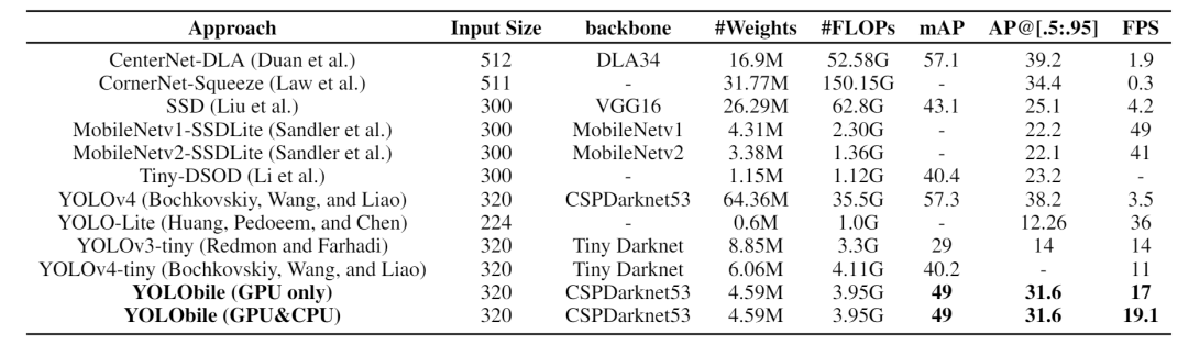 下表展示了YOLObile与其他具有代表性的物体检测网络在准确率与速度方面的具体比较。值得注意的是,他们的GPU-CPU协同计算优化方案可以进一步将执行速度提高至19FPS。