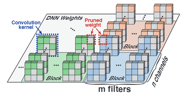 在这种剪枝方案中,每层的权重矩阵将被划分为等大小的多个小区块(block),因此,每个小区块中将包含来自m个filter的n个channel的权重。在每个小区块中,他们对被修剪权重的位置做出了如下的限定,需要修剪所有filter相同位置的一个或多个权重,同时也修剪所有通道相同位置的一个或多个权重。从另一个角度来看,这种剪枝方案将权重的修剪位置将贯穿了整个小区块中所有的卷积核(kernel)。