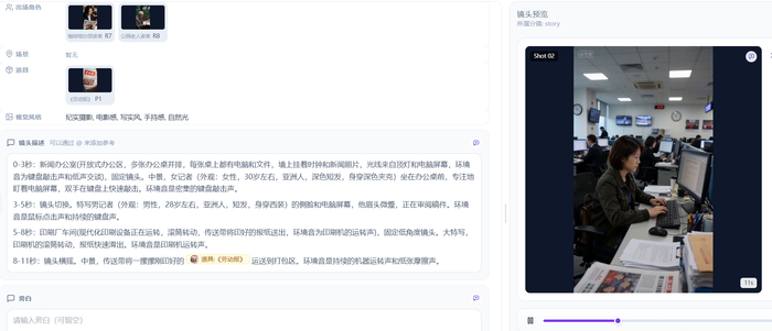 例如,记者仅简单提供了“一位女记者先后在造船厂采访工人,一位女记者在企业调查采访,一位男记者在进博会现场采访。他们回到办公室后坐在办公桌前撰写稿件。晚上一份份报纸在印刷厂里印刷出来,白天报纸被送到不同的读者手中,他们认真地读着报纸。”的指令,AI便写出了将近2000字的分镜脚本,补充了“多张办公桌并排,每张桌上都有电脑和文件,墙上挂着时钟和新闻照片,光线来自顶灯和电脑屏幕,环境音为键盘敲击声和低声交谈”等详实的细节。最终生成的视频虽然在细节上有些漏洞,能看出AI感,但完整度远超预期。