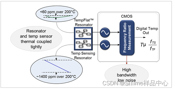 DualMEMS 技术独特地允许在单个管芯内共同制造两个硅 MEMS 谐振器。一个谐振器采用 SiTime 的 TempFlat™ MEMS 技术设计,可在温度范围内实现平坦的频率响应。在没有补偿电路的情况下,TempFlat MEMS 单独在 -40°C 至 +85°C 的温度范围内将硅 MEMS 振荡器的未补偿频率稳定性显着提高到小于 ±60 ppm。 TempFlat-MEMS 增强的温度频率稳定性比石英晶体好两倍,在某些应用中无需温度传感器和外部补偿电路。对于需要更好频率稳定性的云服务器和电信基站等应用,TempFlat MEMS 大大简化了所需的补偿电路,并降低了整体系统尺寸、功耗和成本。 DualMEMS 芯片中的第二个谐振器设计用作极其精确的温度传感器。它的频率对温度变化很敏感,线性斜率为≈±7 ppm/°C。这两个谐振器之间的频率比以 30 µK 的分辨率和以 100 秒的频率运行的带宽提供了极其快速和准确的谐振器温度读数。温度读数用作混合信号 CMOS IC 中采用的温度补偿算法的输入。最终,Elite Platform Super-TCXO 的温度补偿频移在 -40°C 和 +85°C 之间降低到小于 ±1 ppm。这种温度传感方案称为 TurboCompensation。