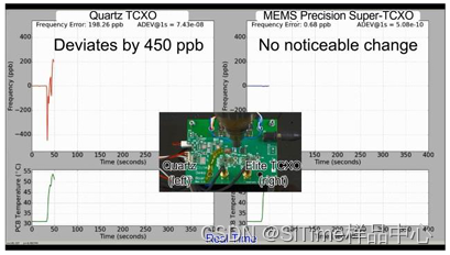 Quartz TCXO 性能从根本上受到分立温度传感器的使用的阻碍。 石英晶体谐振器和单独的温度传感器之间缺乏热耦合,因此无法设计快速温度补偿回路并消除热梯度而不引起回路稳定性问题和性能问题。 因此,基于石英的 TCXO 通常具有 5 到 10 Hz 的补偿带宽,太慢而无法跟踪快速的温度变化,当石英 TCXO 受到气流和/或温度扰动时会导致频率突然跳跃。