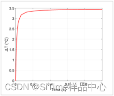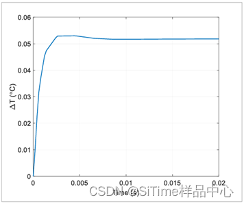 图 4:石英晶体谐振器和带有温度传感器的 CMOS 芯片之间的温差,对流热通量入射在石英晶体顶部。 观察到接近 3.5K 的温度偏移,系统需要将近整整一秒才能稳定到该值。