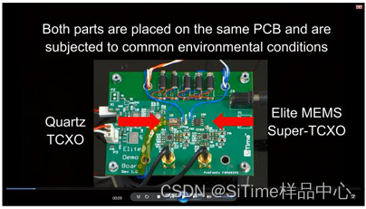 观察 Elite Platform Super-TCXO 与 50-ppb 石英 TCXO 在气流、温度斜坡、抽头测试和 VDD 波动下的动态性能。