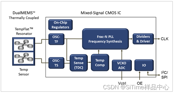 SiTime 的 Elite Platform™ 振荡器和 Super-TCXO™ 系列基于一种新颖的架构,由 DualMEMS™ 芯片和混合信号 CMOS IC 组成,具有专有的温度补偿方案和低噪声频率合成器。这种架构可实现出色的动态性能、超低抖动、宽频率范围和可编程性。凭借 DualMEMS 技术,SiTime 利用公司丰富的 MEMS 设计和制造专业知识以及对硅作为热、机械和电气材料的理解来生产世界上最准确的温度传感器,从而以更低的成本获得类似 OCXO 的性能,低功耗 TCXO 实现。从根本上说,独特的 DualMEMS 芯片结构和 TurboCompensation™ 温度补偿可在温度范围内实现卓越的频率稳定性和对动态热干扰的稳健性。基于石英晶体的 TCXO 无法与 DualMEMS Super-TCXO 器件的稳定性和弹性相匹配。