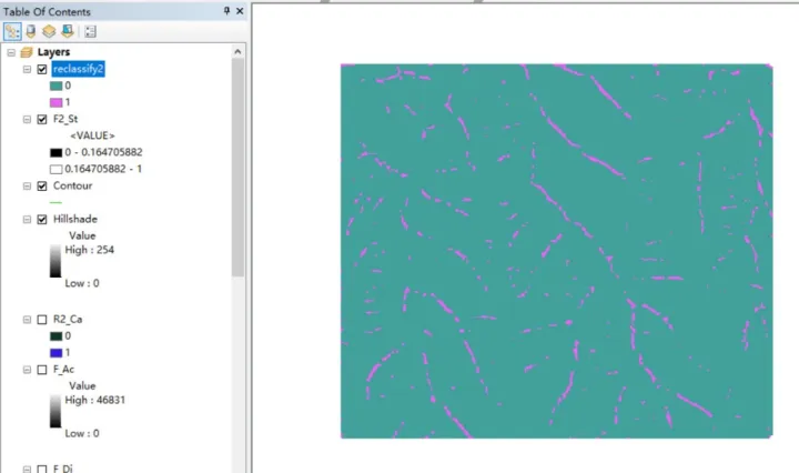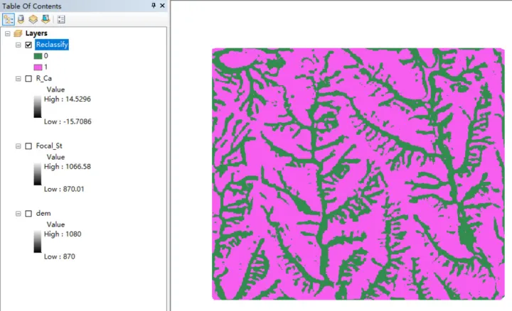 在显示的重分类对话框内,将阈值(0.52585)以下赋值为0,阈值(0.52585)以上赋值为1点击确定之后可以得到重分类结果,如下图所示。