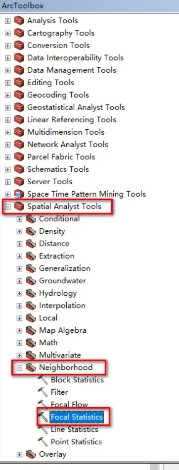 在ArcToolbox内点击“Spatial Analyst工具\邻域分析\焦点统计,调用焦点统计工具。