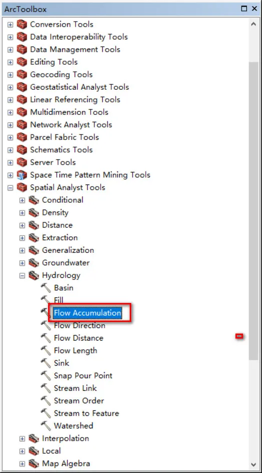 在ArcToolbox内点击“Spatial Analyst工具\水文分析\流量”,调用流量工具。