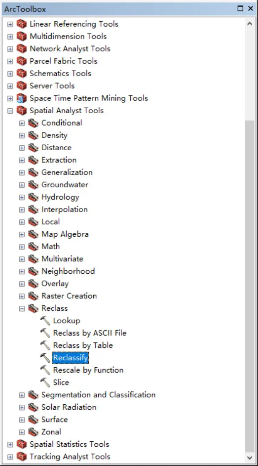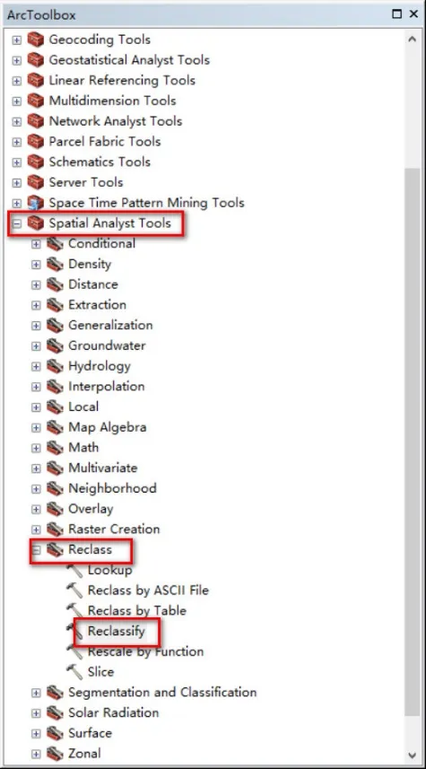 在ArcToolbox内点击“Spatial Analyst工具\重分类\重分类”,调用重分类工具。