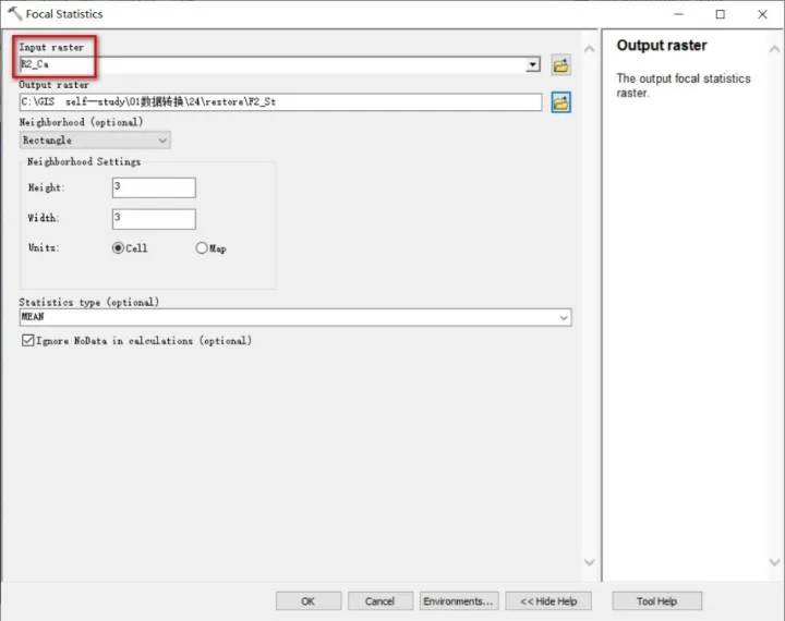 在显示的焦点统计对话框内,输入栅格为上一步栅格计算后的栅格点击确定之后得到统计结果,如下图所示。